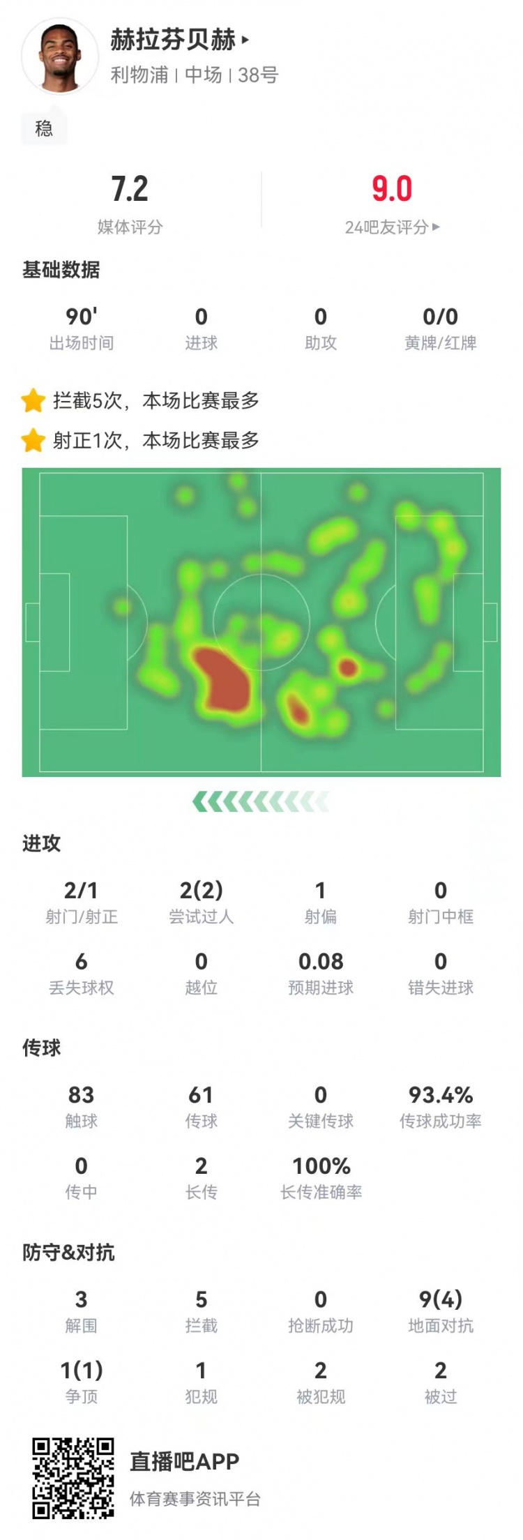 12月10日讯 利物浦在本轮欧冠对阵国米,赫拉芬贝赫本场数据如下: