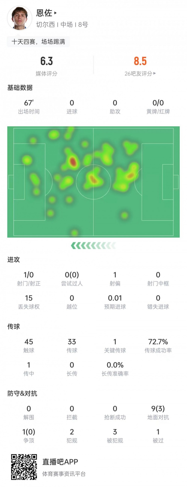 恩佐本场数据:解围拦截抢断挂零,10次对抗3次成功,获评6.3分