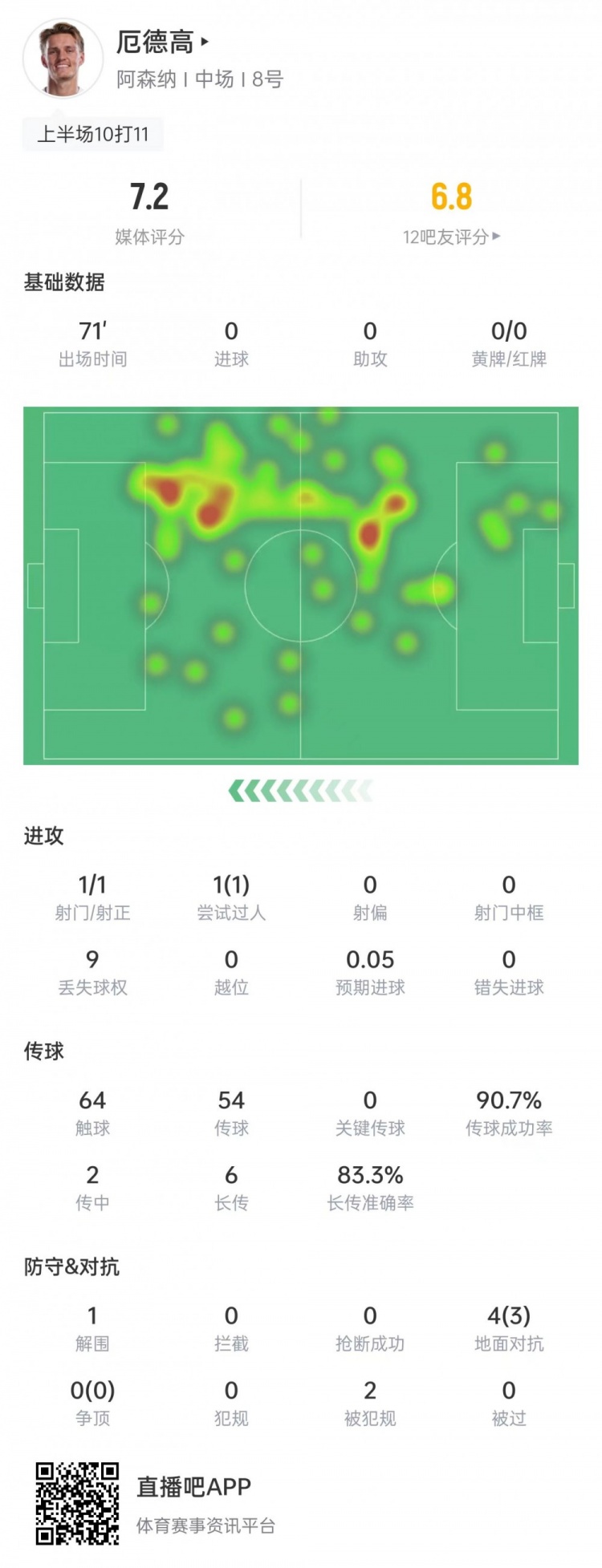 厄德高本场数据:传球成功率90.7%,4次对抗3次成功,获评7.2分