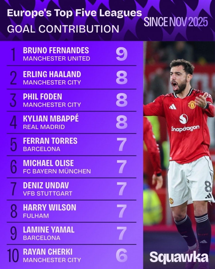 五大联赛11月以来参与进球榜:B费9球居首,哈兰德、姆巴佩8球
